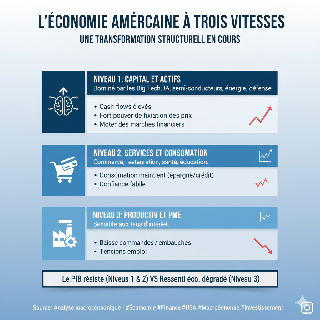 Il ne s’agit pas d’une incohérence statistique, mais d’une transformation structurelle : l’économie américaine fonctionne désormais selon trois niveaux parallèles et de plus en plus dissociés.